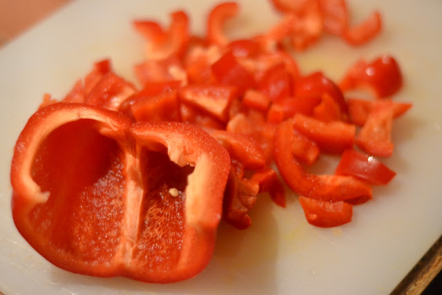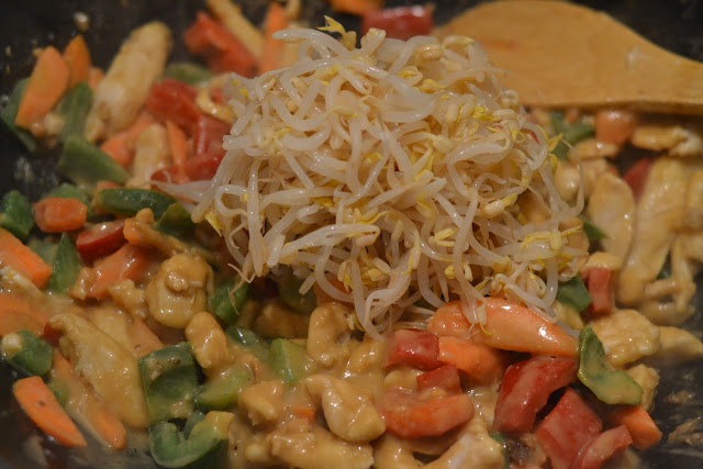 Heat a wok with 2 tbsp oil, add chicken. Stir for a minute and add ginger and garlic. Add carrots first, then peppers. Stir for a short while, the veggies should stay crispy. Now add the sauce and stir only until it thickens. Now add the bean sprouts and onions. Don't forget to sprinkle with crushed peanuts. Serve with rice noodles or rice.